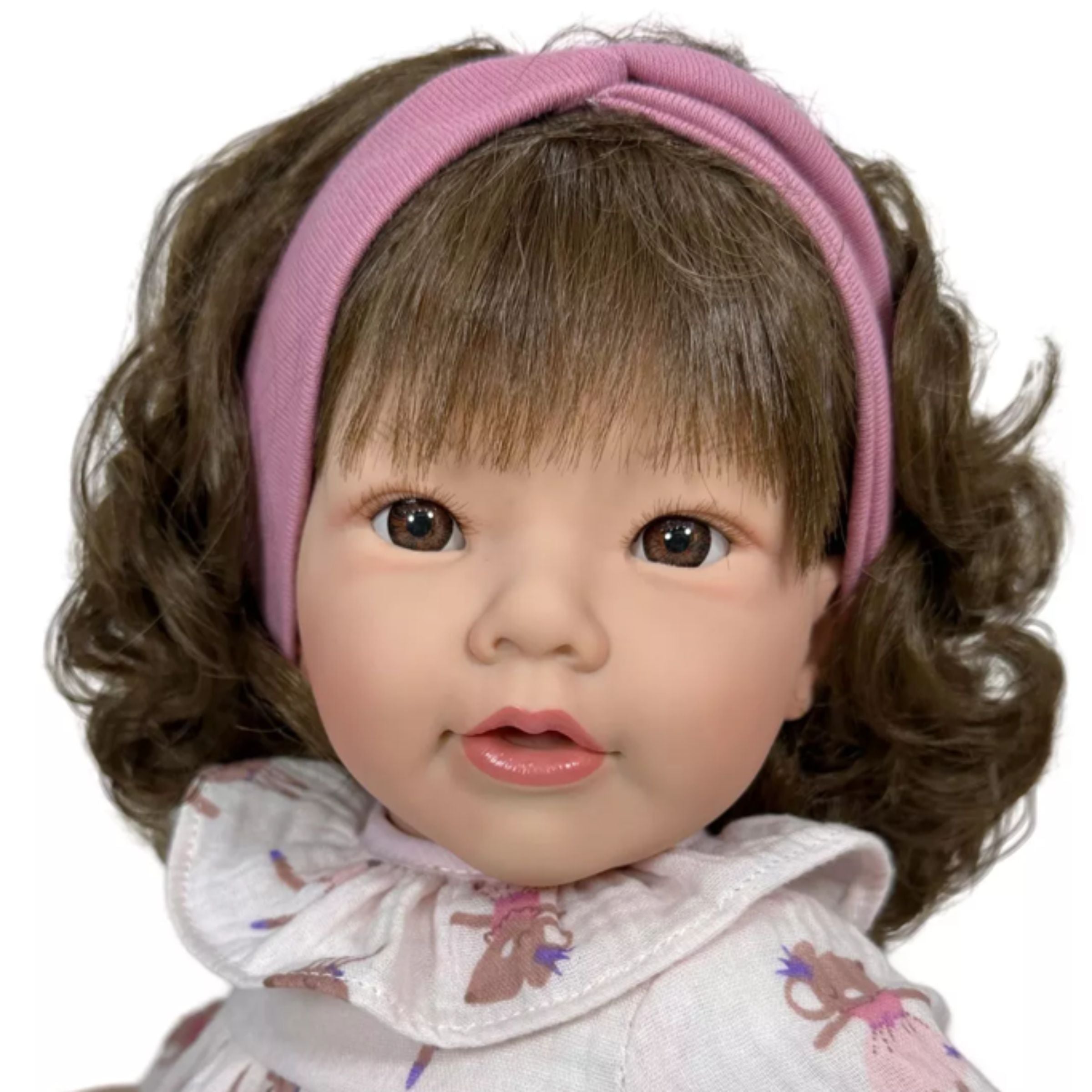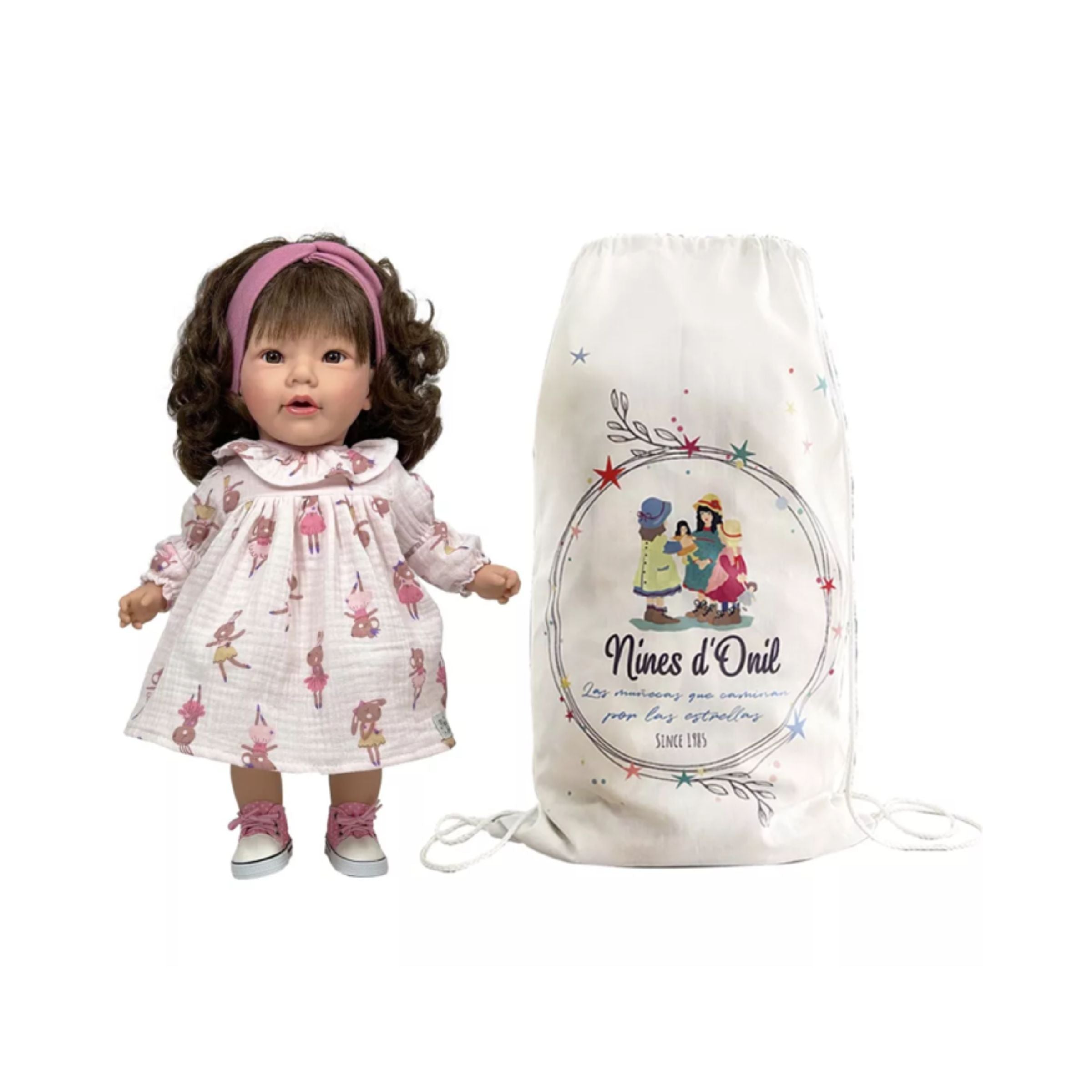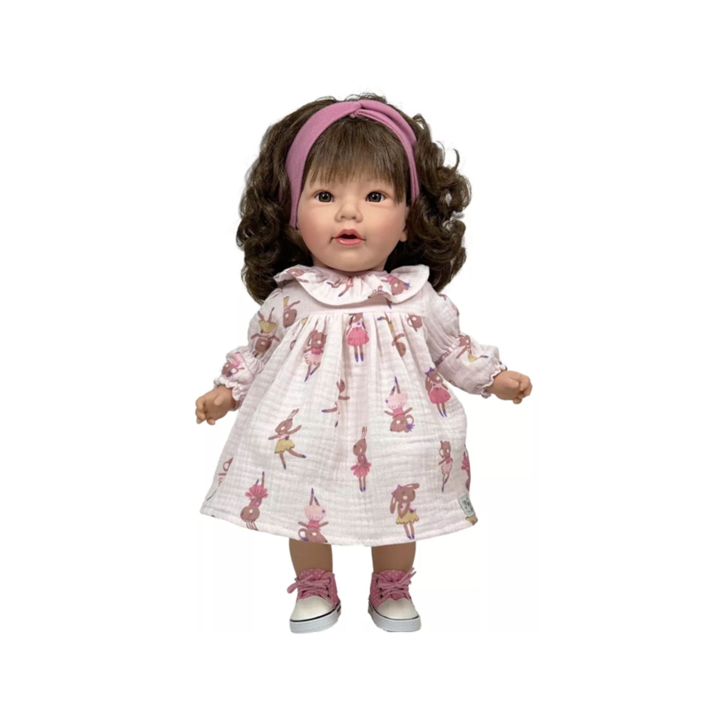 Meet Chloe, a beautifully crafted 45cm doll by Nines d’Onil. Made in Spain with exquisite attention to detail, she features a soft, hypoallergenic fabric body and smooth vinyl limbs for realistic play. Her hand-applied natural hair eyelashes and glossy lips bring her gentle expression to life. Dressed in a charming muslin mouse-print dress with matching pink shoes and headband, Chloe is the perfect traditional doll for cuddles and play. A timeless keepsake that combines quality, comfort, and classic style - ideal for gifting or collecting.